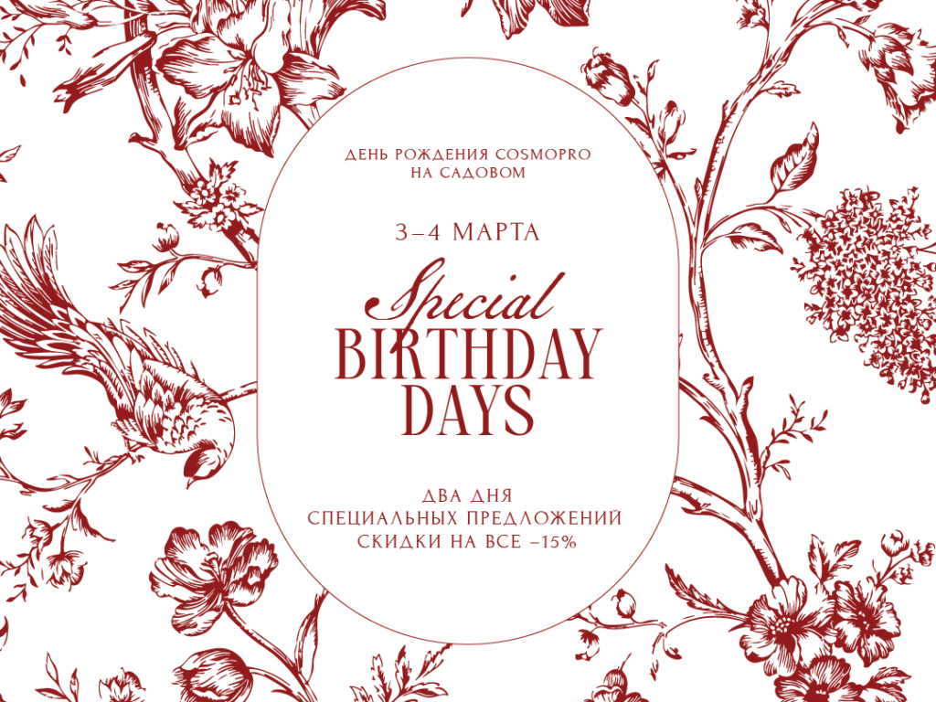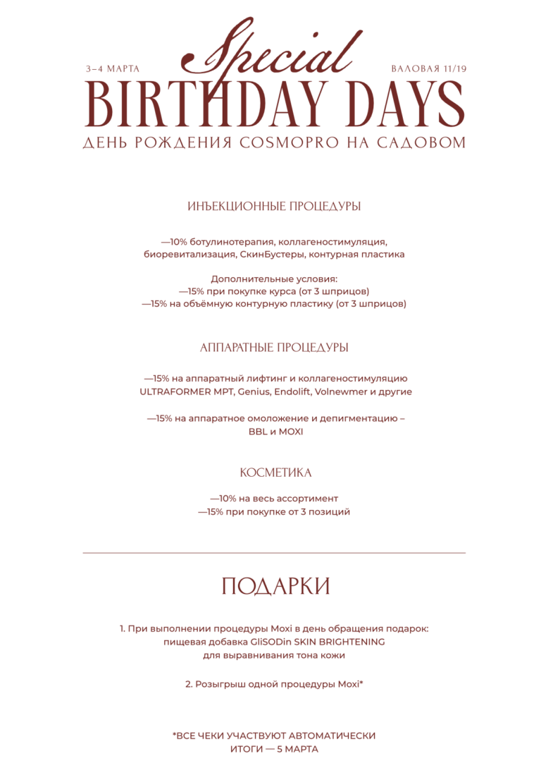 Данный перечень предложений действителен 3 и 4 марта в филиале COSMOPRO на Садовом кольце.