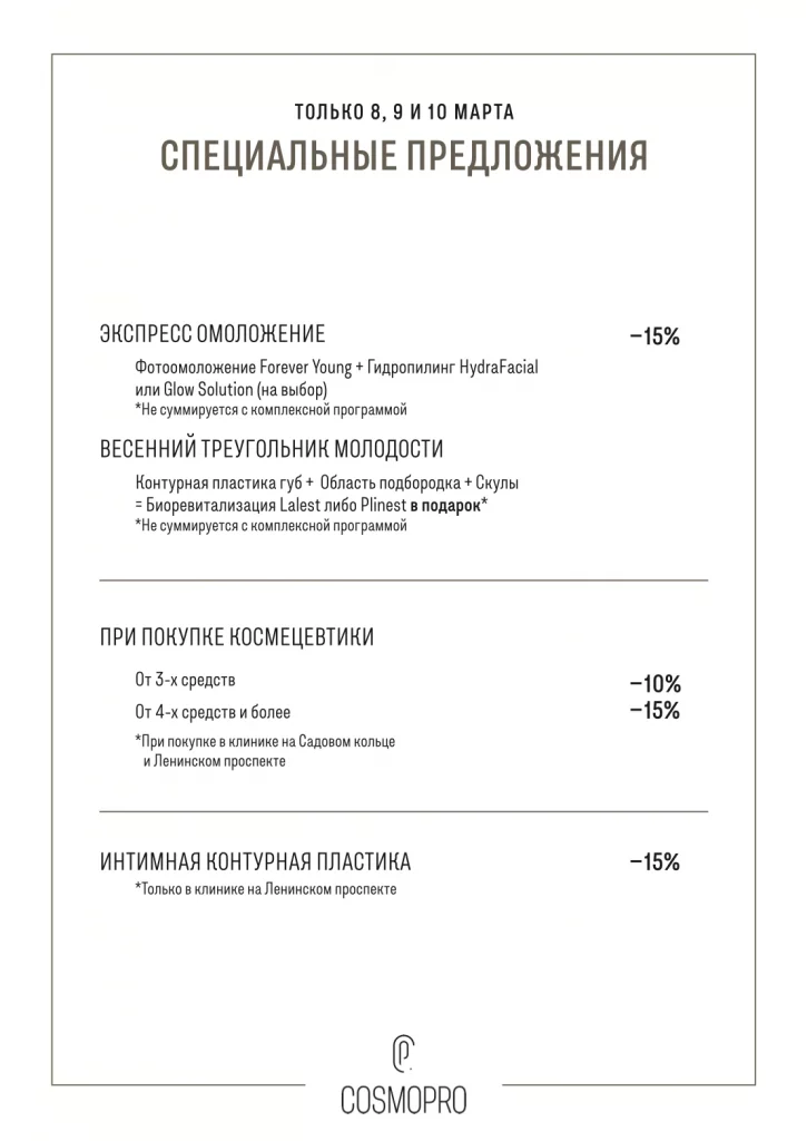 Впереди весенний праздник, а значит, время яркого предложения от COSMOPRO!Предложение распространяется в клиниках на Садовом кольце и на Ленинском проспекте 8,9 и 10 марта. Мы приглашаем вас на процедуры в клинику для создания весеннего настроения и подготовки к прекрасному женскому празднику! Ждем вас в наших клиниках!С любовью, COSMOPRO❤️ Записаться на консультацию Записаться на консультацию Реклама. ООО “Космо-Про”. erid: LjN8KHtfo *Правила проведения акции: Акция проводится с 08.03.2024 по 10.03.2024 гг. Акция проводится на территории клиники COSMOPRO на Садовом кольце и на Ленинском проспекте в г.Москва